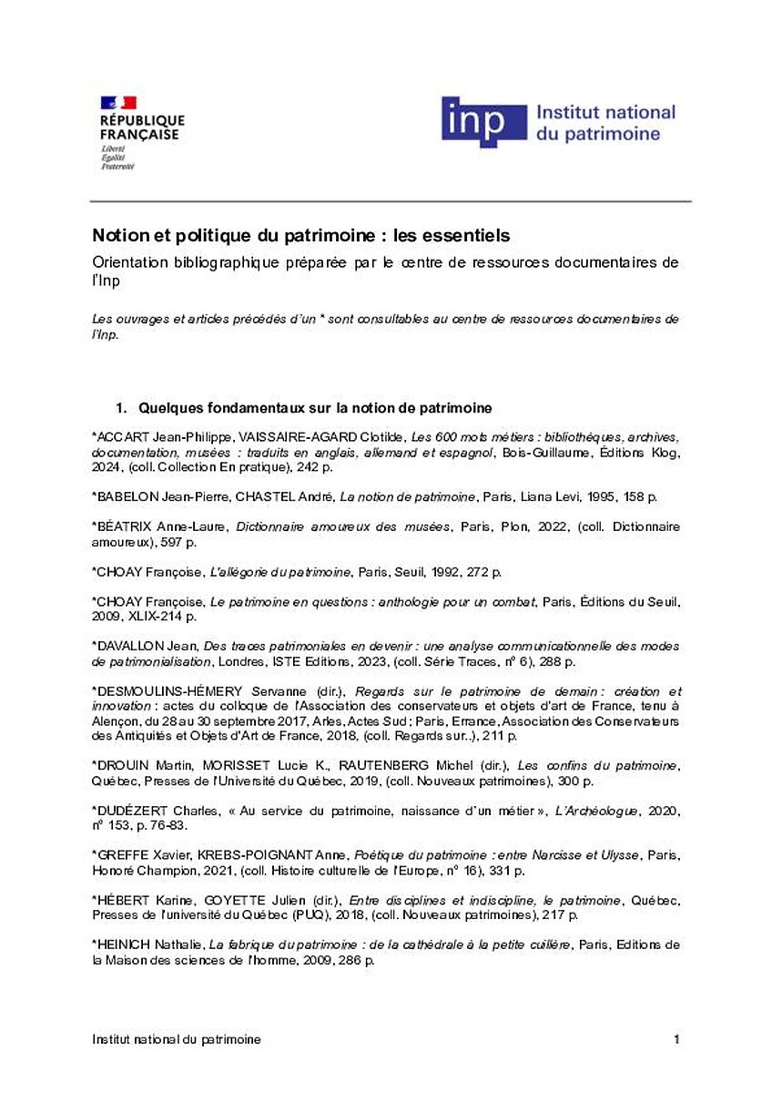 Cette bibliographie a été réalisée dans le cadre d'un module d'enseignement ou d'une formation à destination des professionnels du patrimoine. Elle n’a pas prétention à être exhaustive mais propose les références de quelques outils essentiels, faciles à se procurer, pour aider ces professionnels dans leurs missions.