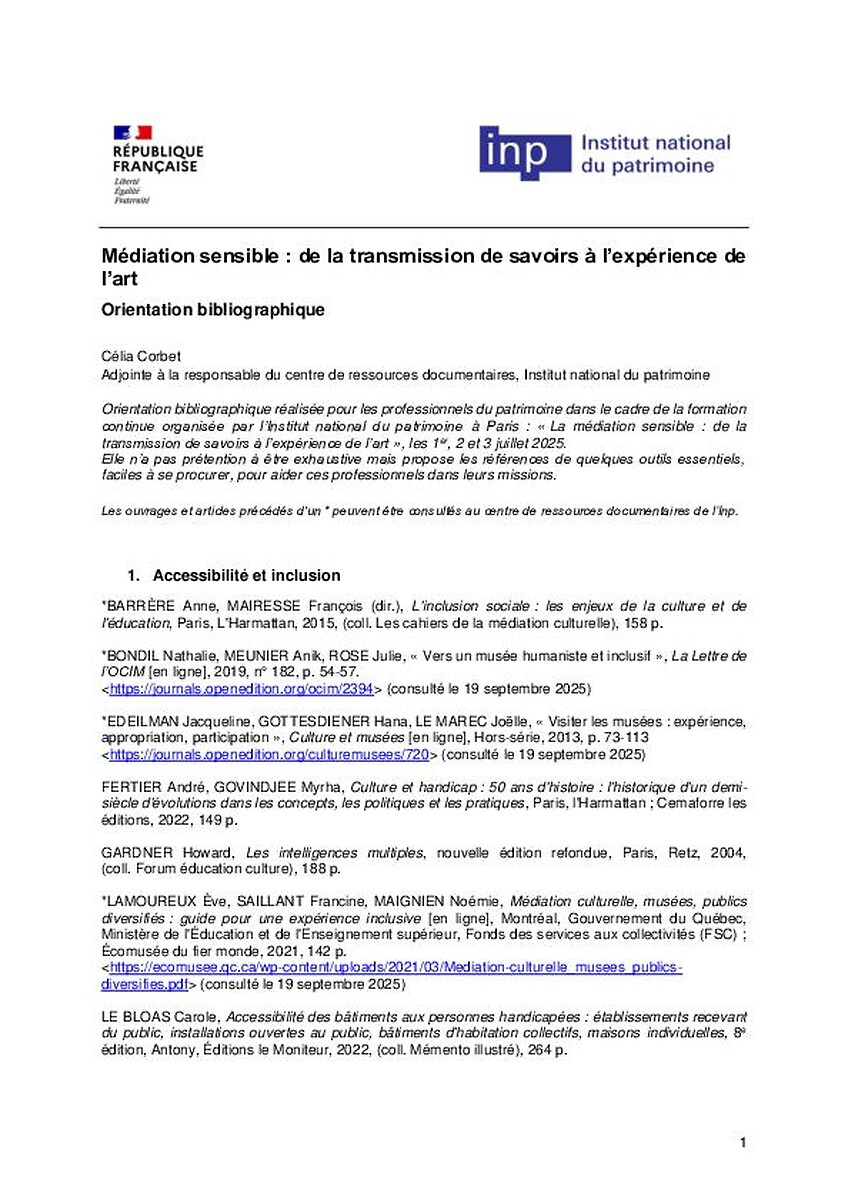 "Muséothérapie : du « CARE » au « CURE » - Art et santé dans les musées", Médiathèque numérique de l'Inp, 02 décembre 2025 (consulté le 05 décembre 2025), https://mediatheque-numerique.inp.fr/documentation-pedagogique/orientations-bibliographiques/museotherapie-care-au-cure-art-sante-dans-musees
