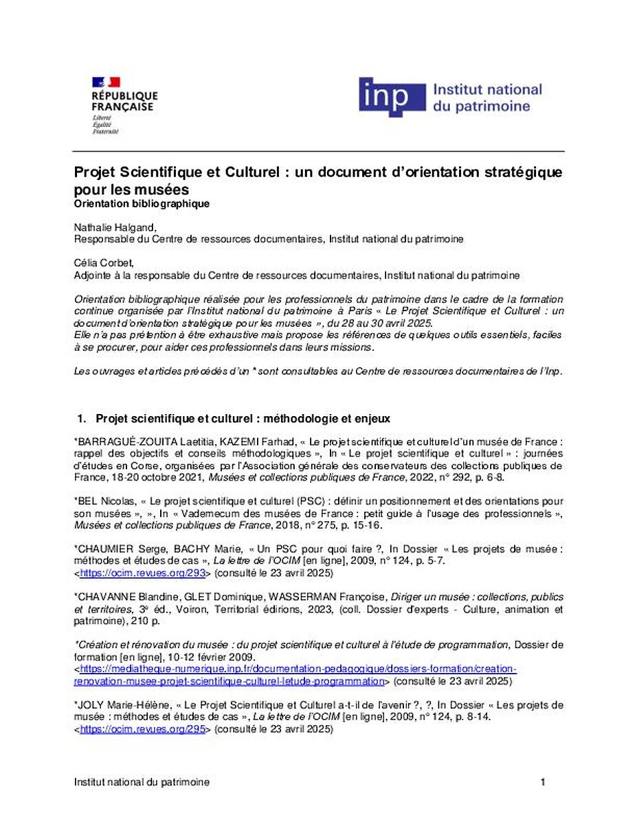 "Outils de pilotage stratégique des établissements patrimoniaux", Médiathèque numérique de l'Inp, 26 novembre 2025 (consulté le 05 décembre 2025), https://mediatheque-numerique.inp.fr/documentation-pedagogique/orientations-bibliographiques/outils-pilotage-strategique-etablissements-patrimoniaux