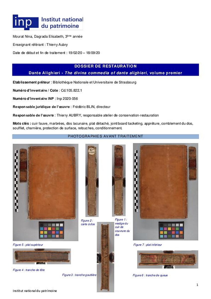 Dossier de restauration : "The Divina Commedia of Dante Alighieri" ; Volume premier.