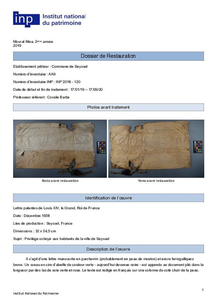 Dossier de restauration : Lettre patentes de Louis XIV, le Grand, Roi de France