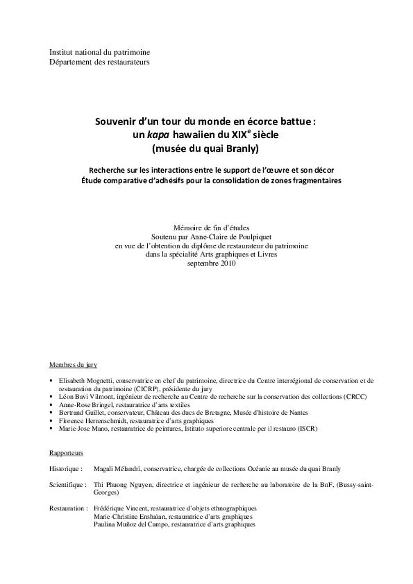 Souvenir d'un tour du monde en écorce battue : un kapa hawaiien du XIXe siècle (Musée du quai Branly, Paris) : recherche sur les interactions entre le support de l'oeuvre et son décor. Etude comparative d'adhésifs pour la consolidation de zones fragmenta…