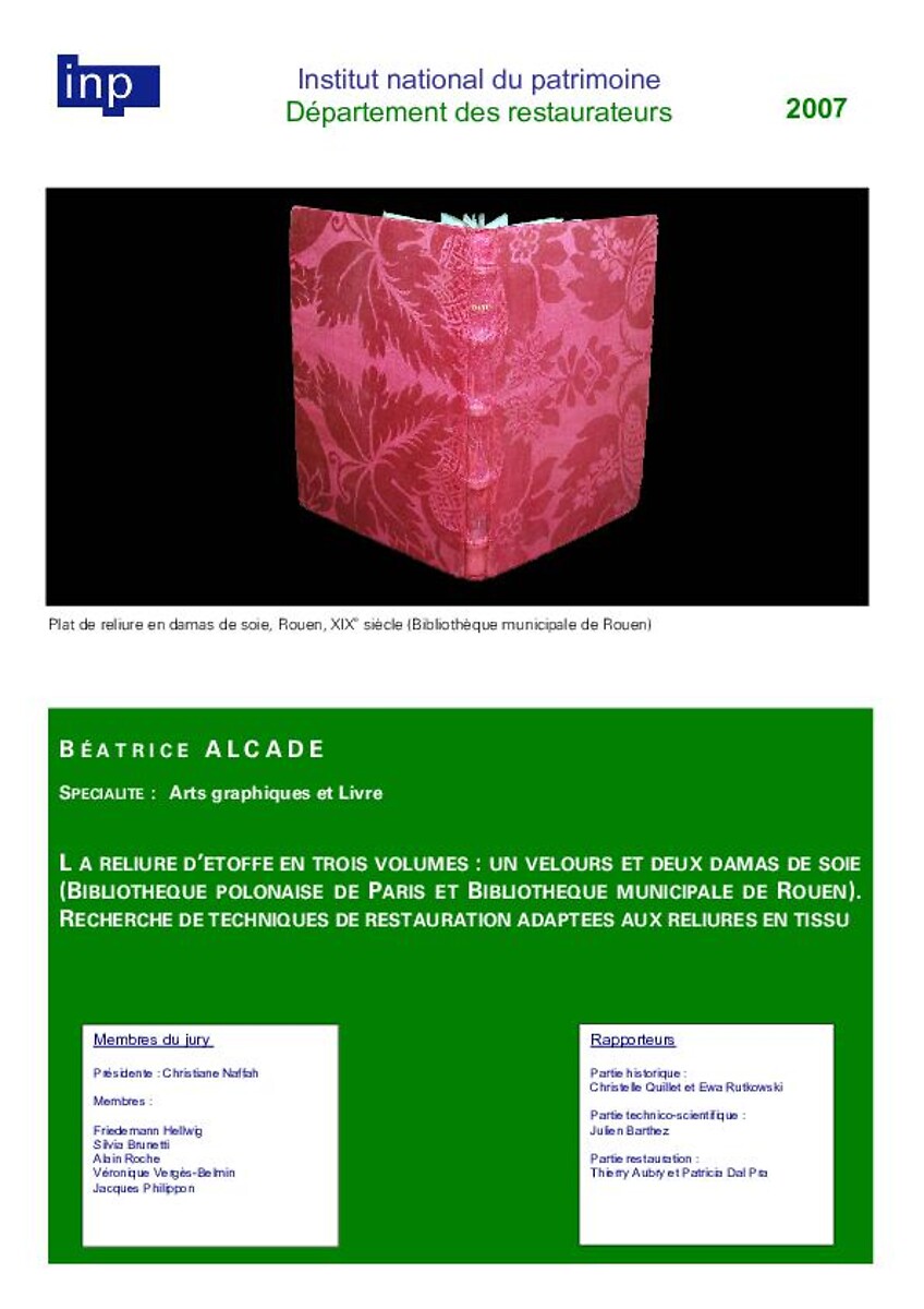 La reliure d'étoffe en trois volumes :un velours et deux damas de soie (Bibliothèque polonaise de Paris et Bibliothèque municipale de Rouen) : recherche de techniques de restauration adaptées aux reliures en tissu