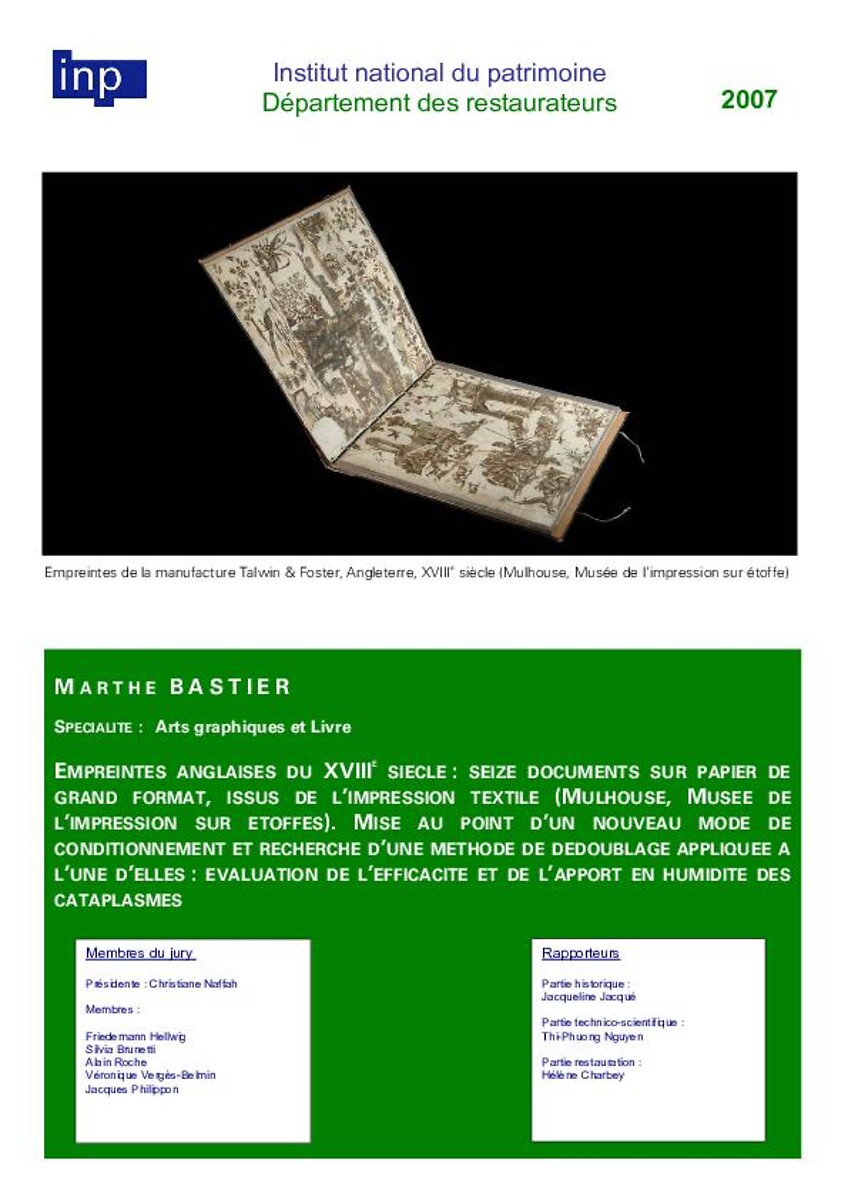 Empreintes anglaises du XVIIIe siècle : seize documents sur papier de grand format, issus de l'impression textile (Mulhouse, Musée de l'impression sur étoffes) : mise au point d'un nouveau mode de conditionnement et recherche d'une méthode de dédoublage …