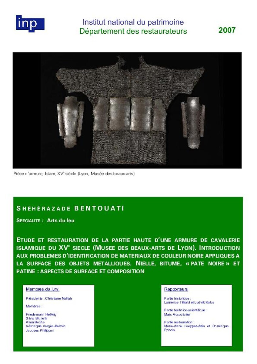 Etude et restauration de la partie haute d'une armure de cavalerie islamique du Xve siècle (Musée des beaux-arts de Lyon) : introduction aux problèmes d'identification des matériaux de couleur noire appliqués à la surface des objets métalliques. Nielle, …