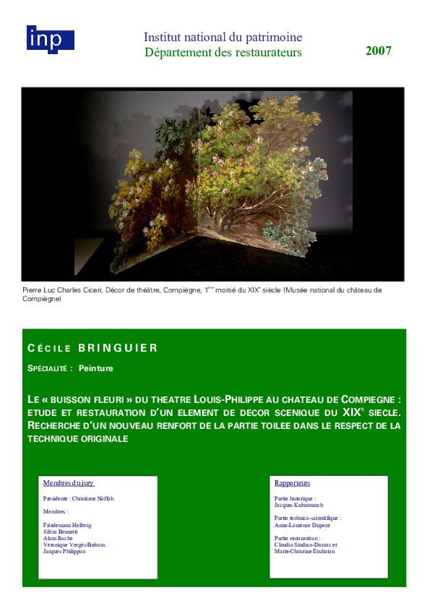 Le "buisson fleuri" du théâtre Louis Philippe au château de Compiègne : étude et restauration d'un élément de décor scénique du XIXe siècle. Recherche d'un nouveau renfort de la partie toilée dans le respect de la technique originale