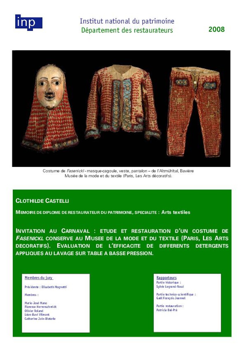 Invitation au Carnaval : étude et restauration d'un costume de Fasennickl conservé au Musée de la mode et du textile (Paris, Les Arts décoratifs) : évaluation de l'efficacité de différents détergents appliqués au lavage sur table à basse pression…