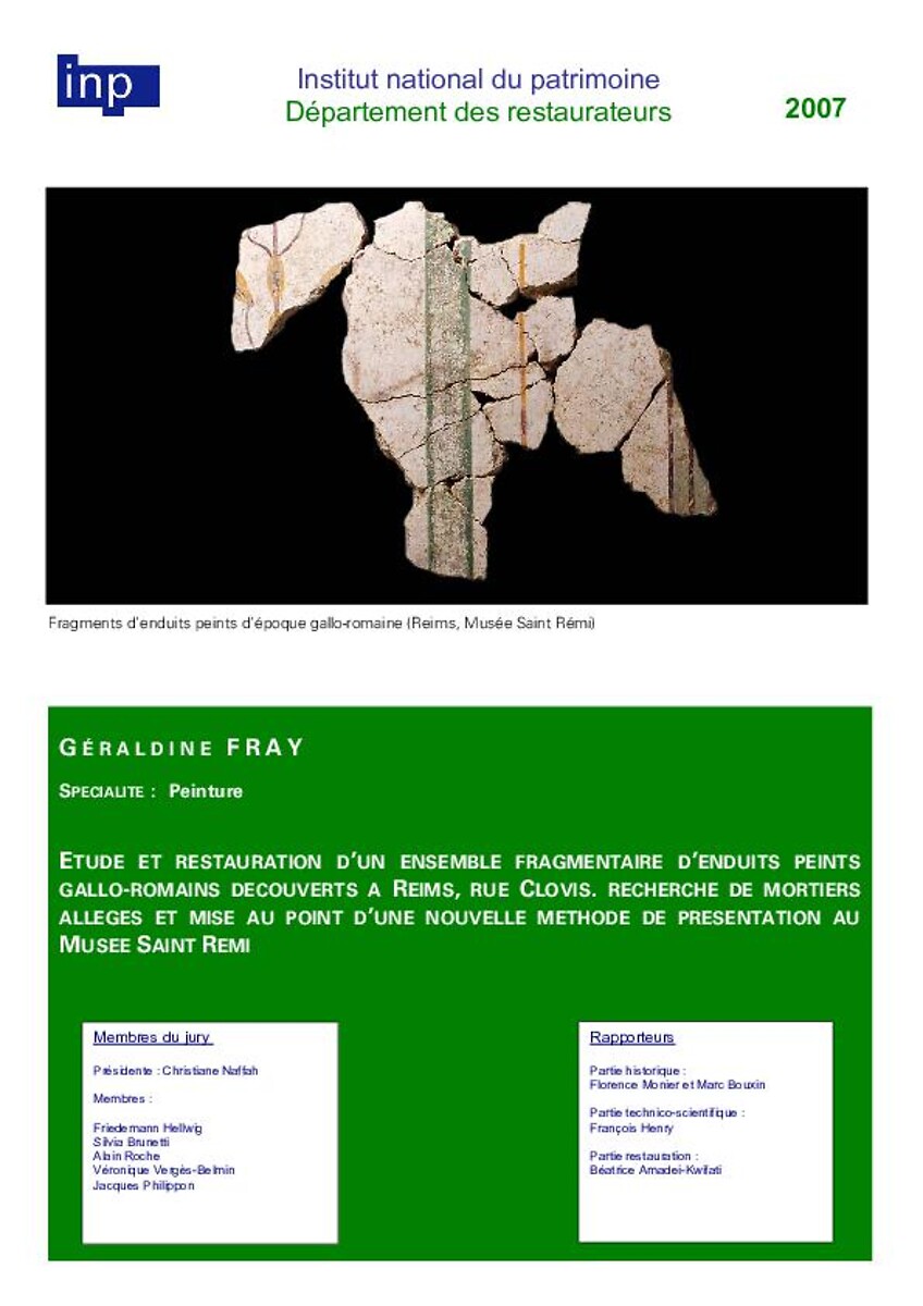 Etude et restauration d'un ensemble fragmentaire d'enduits peints gallo-romains découverts à Reims, rue Clovis : recherche de mortiers allégés et mise au point d'une nouvelle méthode de présentation au musée Saint-Rémi.