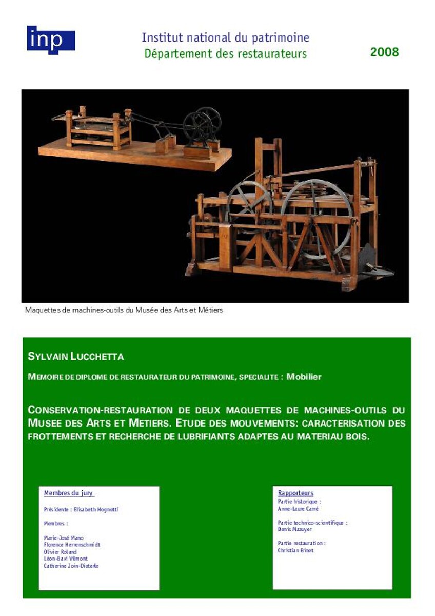 Conservation-restauration de deux maquettes de machines outils du Musée des arts et métiers : étude des mouvements : caractérisation des frottements et recherche de lubrifiants adaptés au matériau bois
