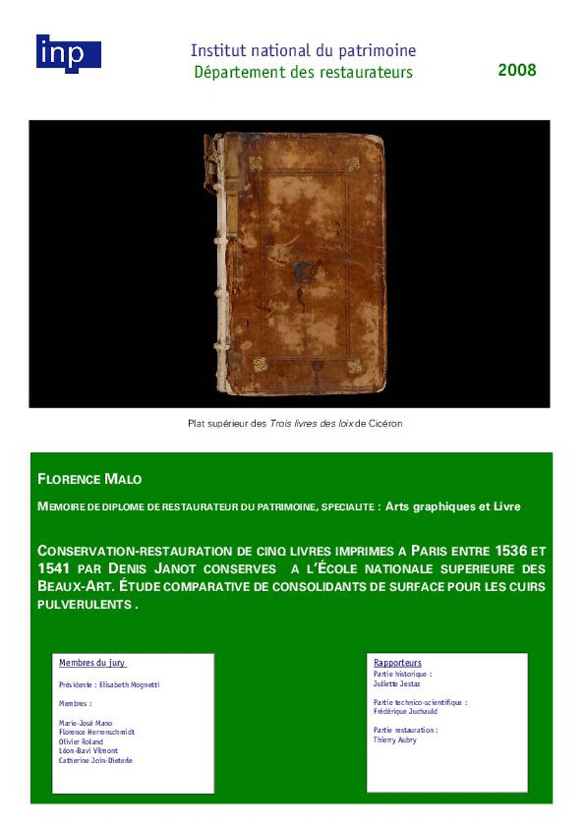 Conservation-restauration de cinq livres imprimés à Paris entre 1536 et 1541 par Denis Janot conservés à l'école nationale supérieure des Beaux-Arts : étude comparative de consolidants de surface pour les cuirs pulvérulents