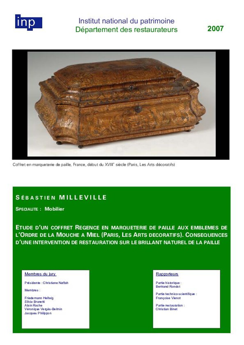Etude d'un coffret Régence en marqueterie de paille aux emblèmes de l'Ordre de la Mouche à miel (Paris, Les Arts décoratifs)