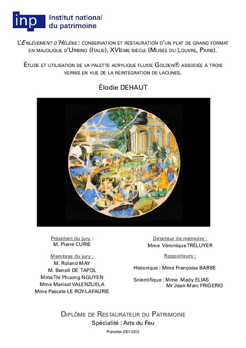 l'Enlèvement d'Hélène : conservation et restauration d'un plat de grand format en majolique d'Urbino (Italie), XVIème siècle : étude et utilisation de la palette acrylique fluide Golden® associée à trois vernis en vue de la réintégration de lacunes.…