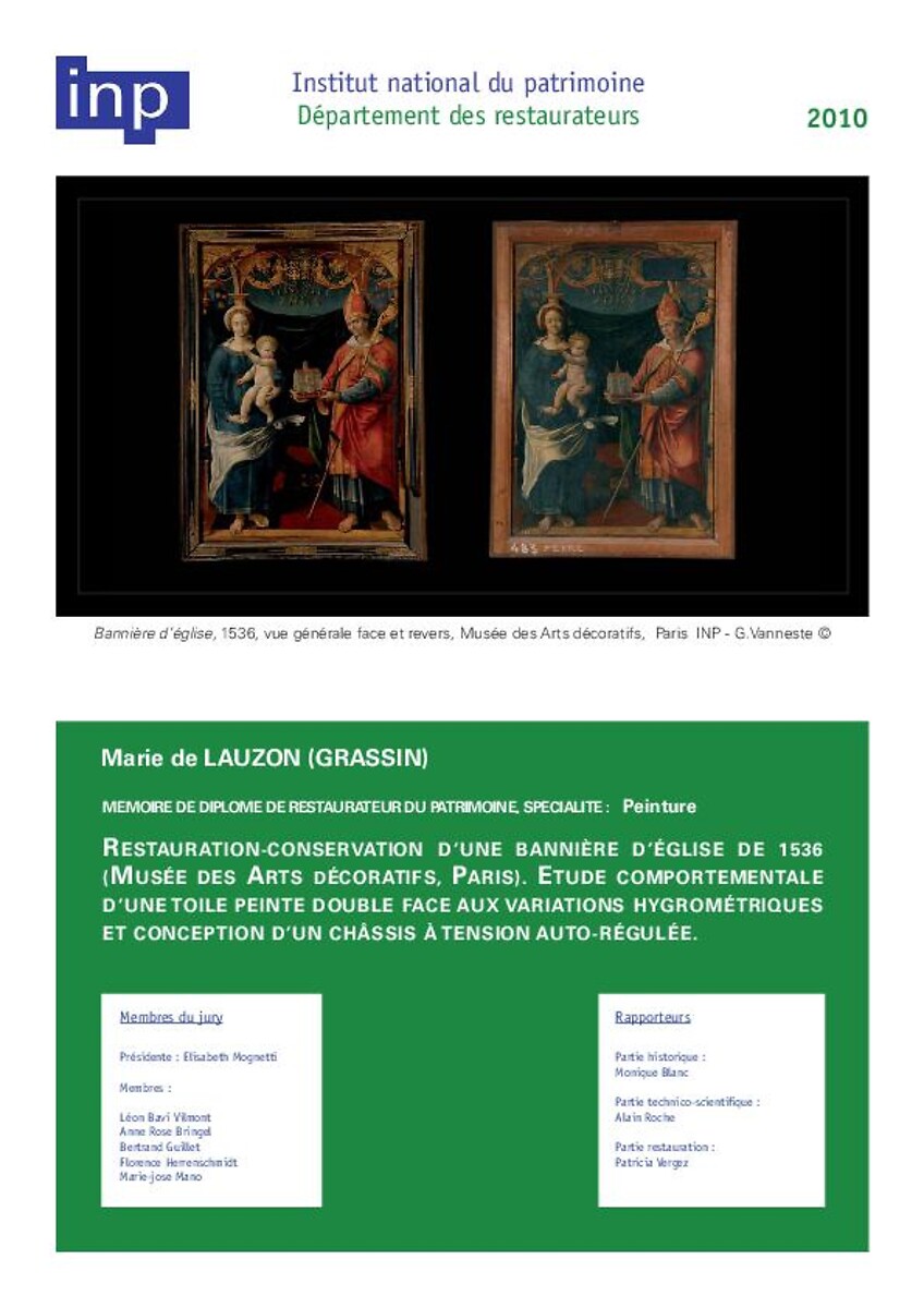 Restauration-conservation d'une bannière de 1536 (Musée des arts décoratifs, Paris) : étude comportementale d'une toile peinte double face aux variations hygrométriques et mise en place d'un chssis à tension auto-régulée