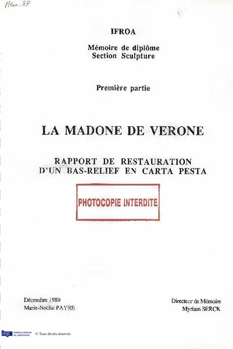 La Madone de Vérone : rapport de restauration d'un bas-relief en carta pesta. La carta pesta, recherche sur une technique italienne du XVème et XVIème siècles