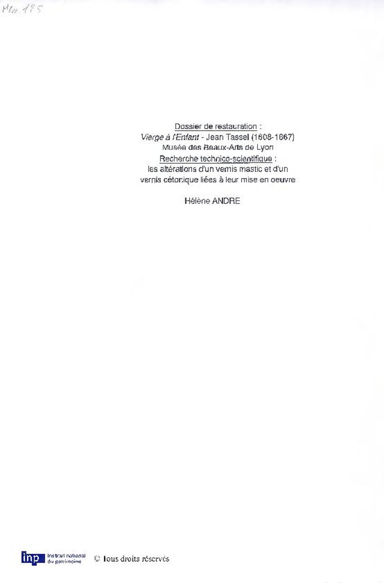 Vierge à l'enfant - Jean Tassel (1608-1667) : recherche technico-scientifique : les altérations d'un vernis mastic et d'un vernis cétonique liées à leur mise en oeuvre
