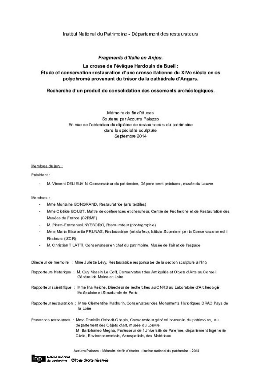 « Fragments d'Italie en Anjou ». La crosse de l'évêque Hardouin de Bueil : étude et conservation-restauration d'une crosse italienne du XIVe siècle en os polychromé provenant du trésor de la cathédrale d'Angers : recherche d'un produit de consolidation d…