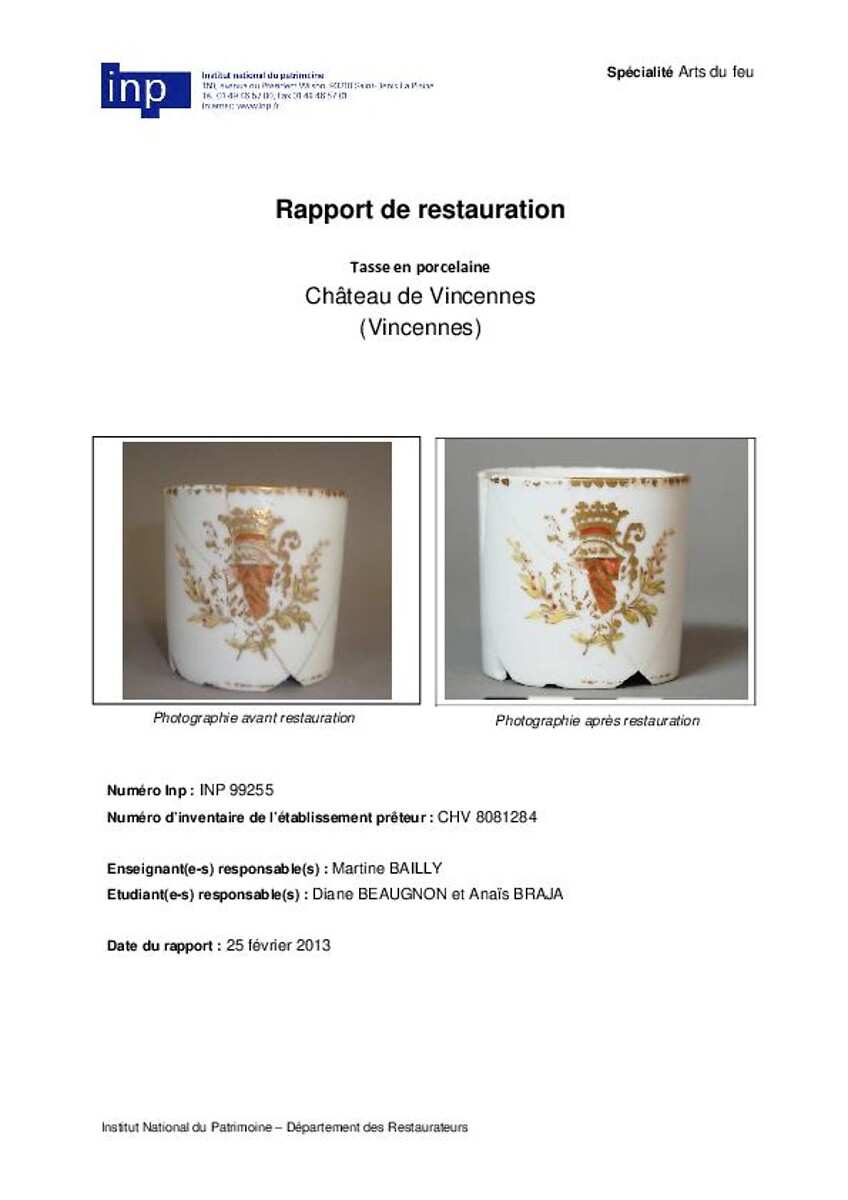 Rapport de restauration tasse en porcelaine