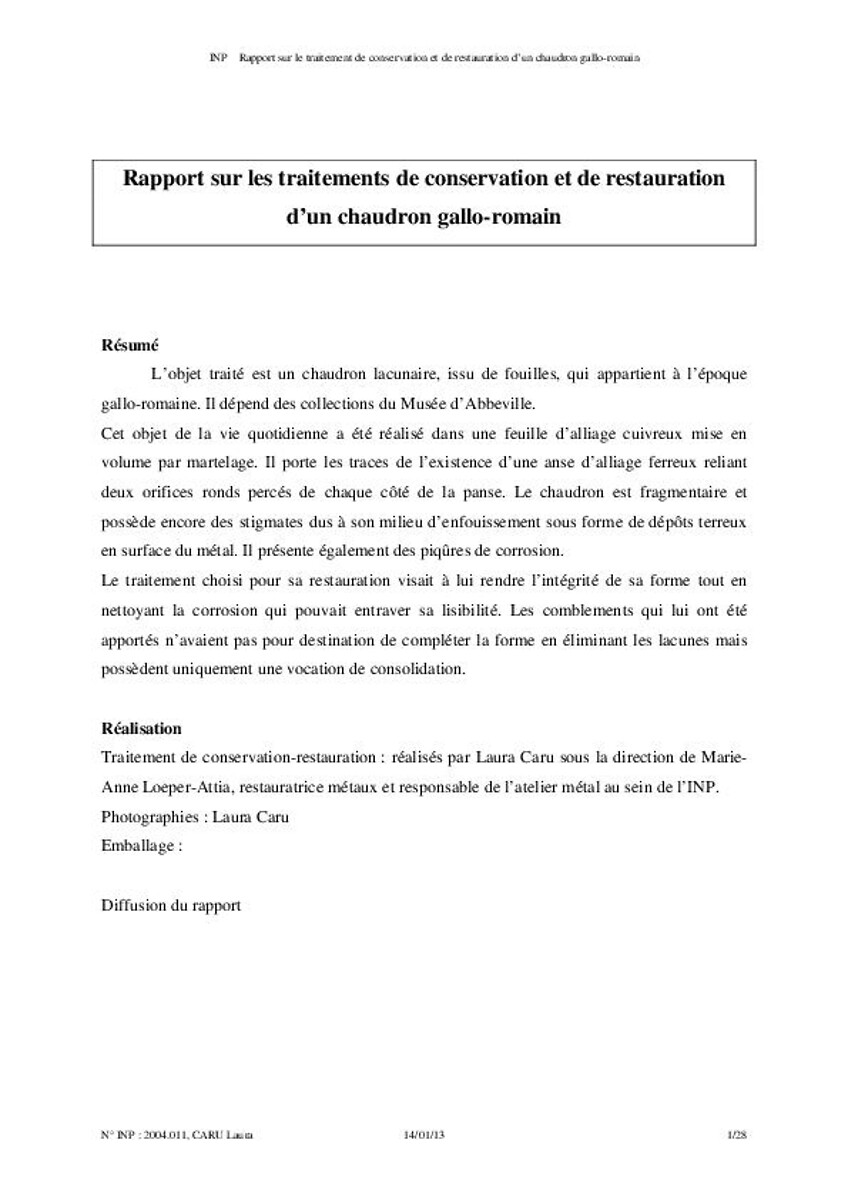 Rapport sur les traitements de conservation et de restauration d'un chaudron gallo-romain