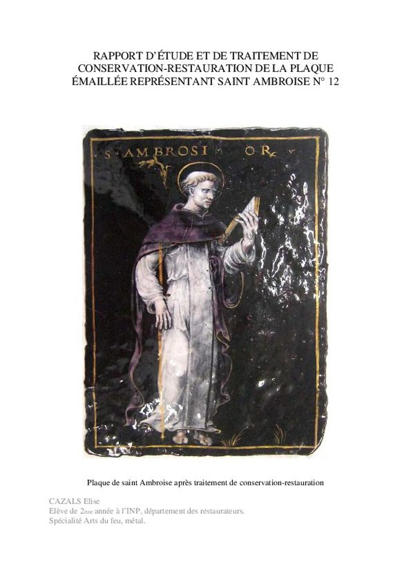 Rapport d'étude et de traitement de conservation-restauration de la plaque émaillée représentant saint Ambroise n° 12