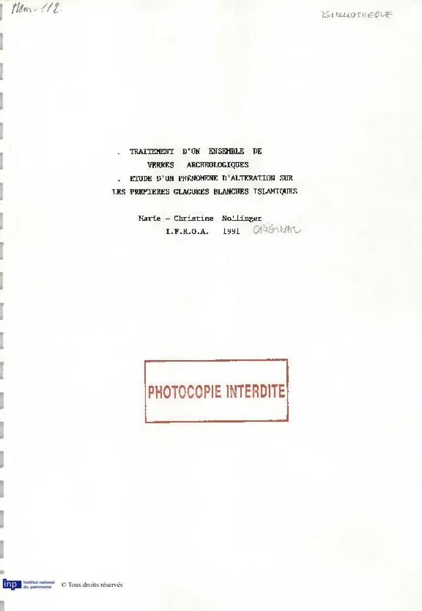 Traitement d'un ensemble de verres archéologiques (unité d'archéologie de la ville de Saint-Denis) : étude d'un phénomène d'altération sur les premières glaçures blanches islamiques. Restauration d'une coupe à décor de lustre polychrome (Musée du Louvre…