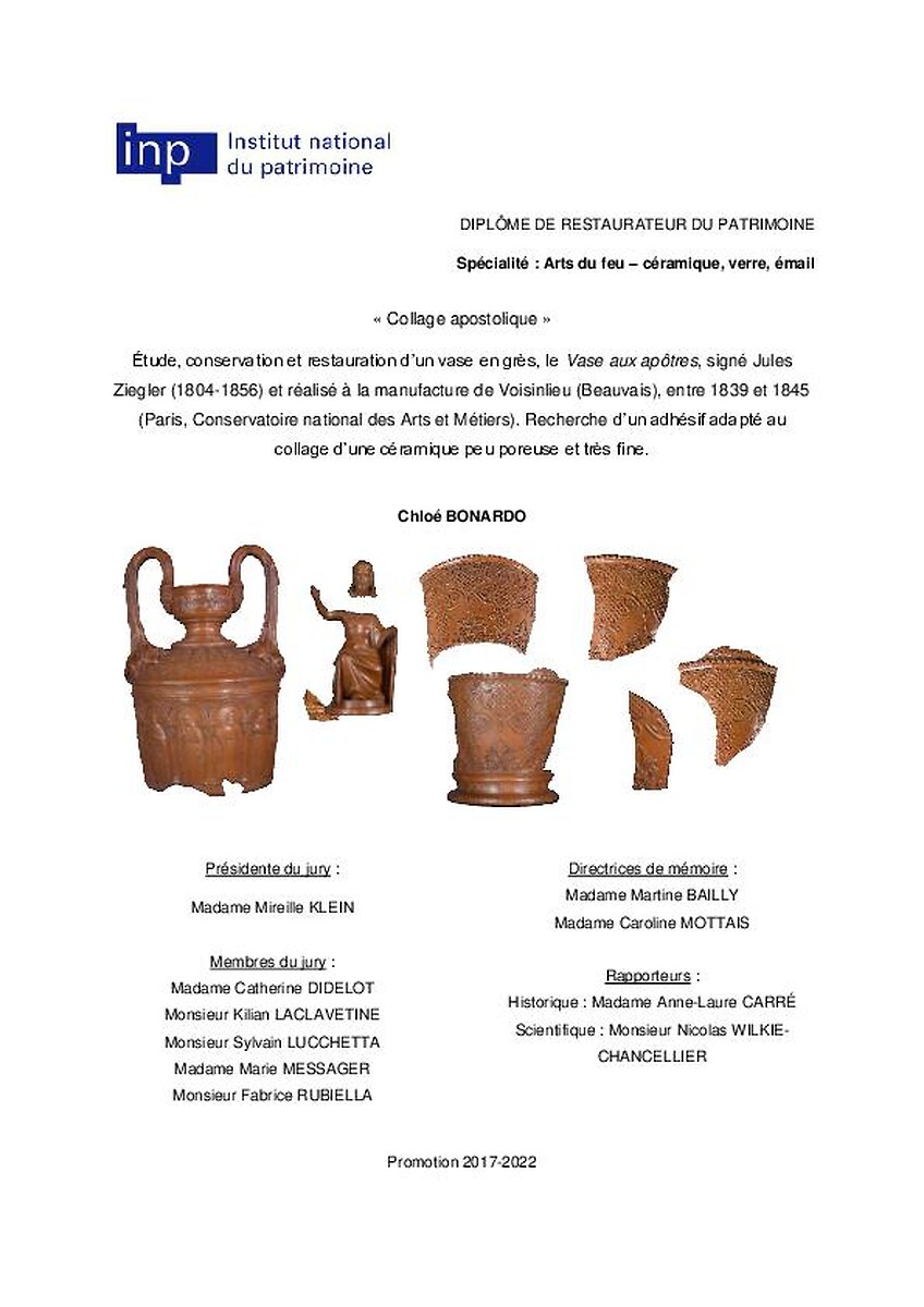 Collage apostolique. Etude et conservation-restauration d'un vase en grès, le "Vase aux apôtres", signé Jules Ziegler (1804-1856) et réalisé à la manufacture de Voisinlieu (Beauvais), entre 1839 et 1845 (Paris, Conservatoire national des Arts et Métiers)…