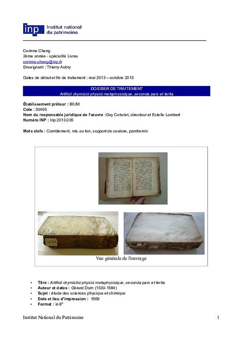 Dossier de traitement: "Artificii chymistici physici metaphysicique...".