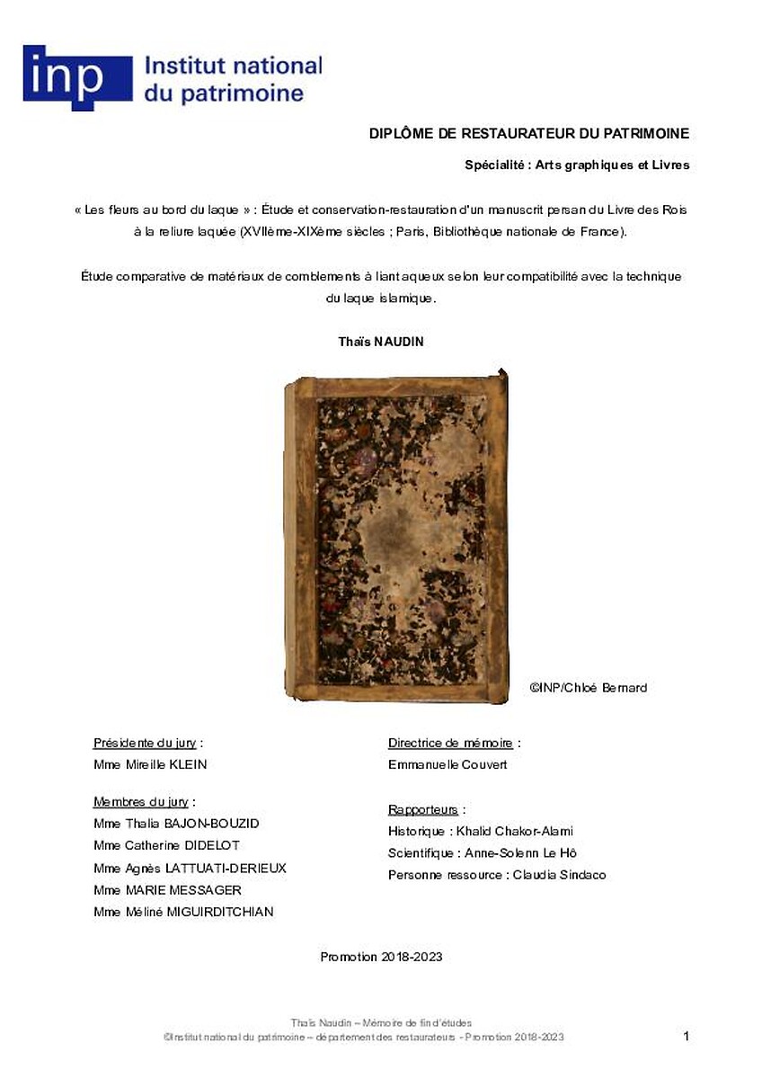 « Les fleurs au bord du laque » : Étude et conservation-restauration d'un manuscrit persan du Livre des Rois à la reliure laquée (XVII ème -XIXème siècles ; Paris, Bibliothèque nationale de France). Étude comparative de matériaux de comblements à lia…