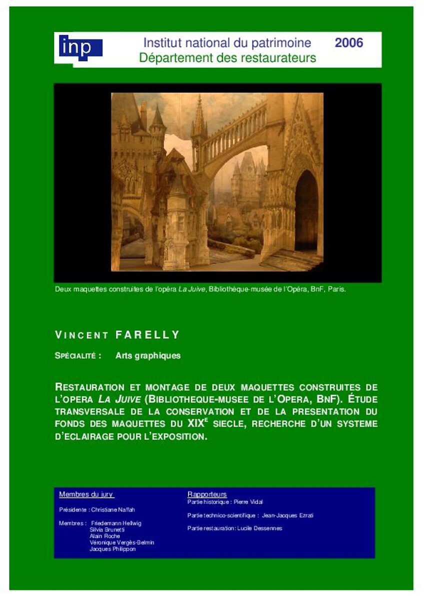Restauration et montage de deux maquettes construites de l'opéra La Juive (Bibliothèque-musée de l'Opéra, BnF) : étude transversale de la conservation et de la présentation du fonds des maquettes du XIXe siècle : recherche d'un système d'éclairage pour l…