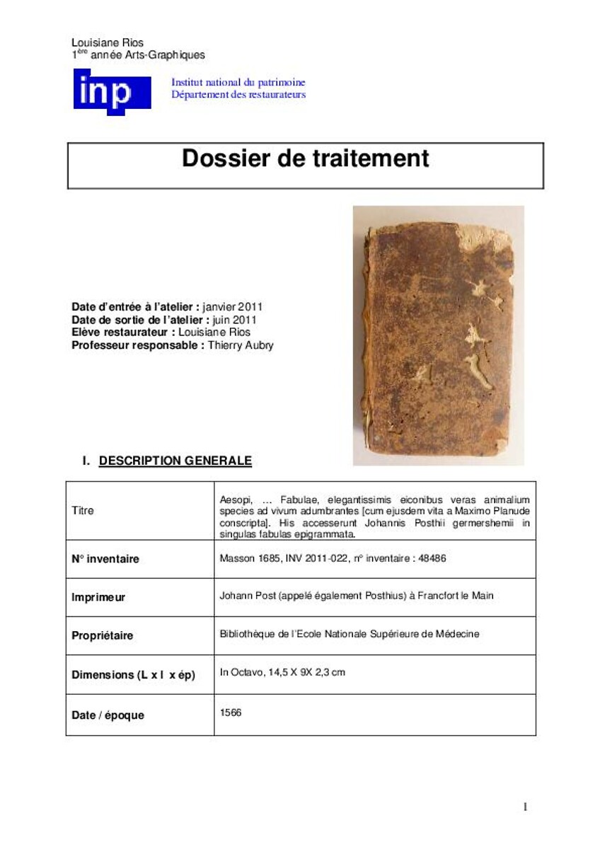 Dossier de traitement: (esopi, ... Fabulae, elegantissimis ...)