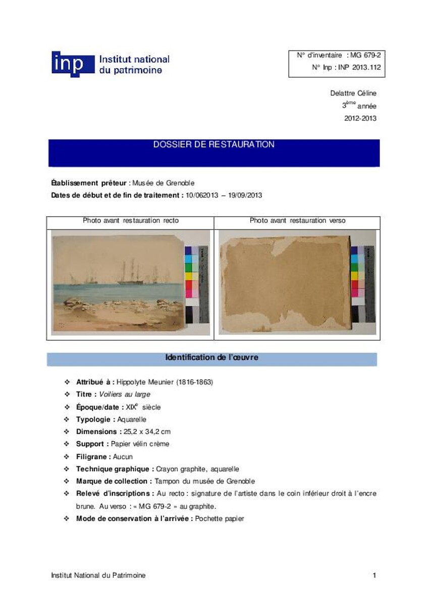 Dossier de restauration (Voiliers au large attribué à Hippolyte Meunier)