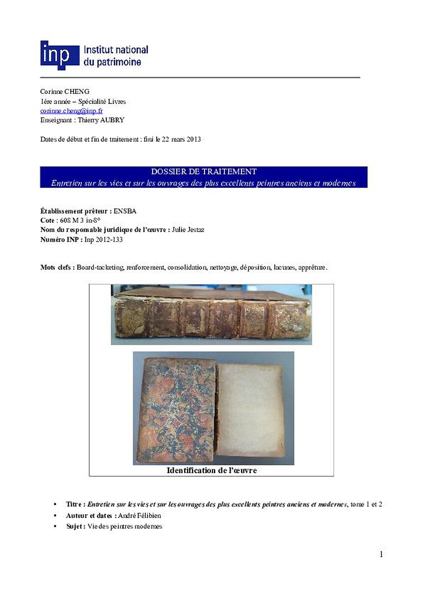 Dossier de traitement: "Entretien sur les vies et les ouvrages des plus excellents peintres...".