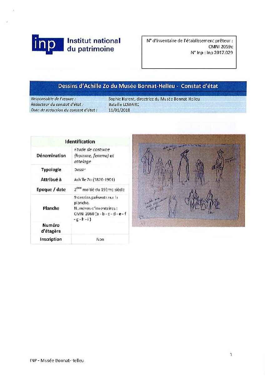Constat d'état et traitement: Etude de costume (homme, femme, attelage) (Dessin attribué à Achille Zo)