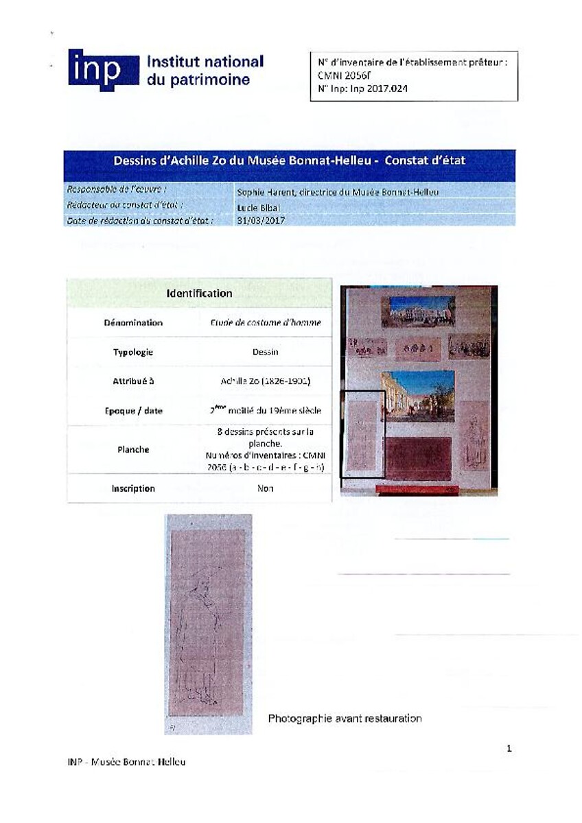 Constat d'état et traitement Etude de costume d'homme (Dessin attribué à Achille Zo)