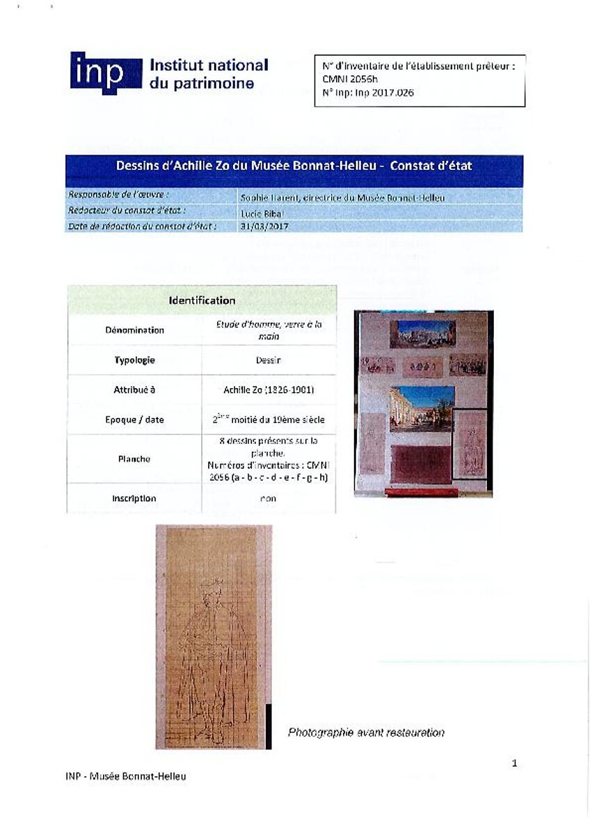 Constat d'état et traitement: Etude d'homme, verre à la main (Dessin attribué à Achille Zo)