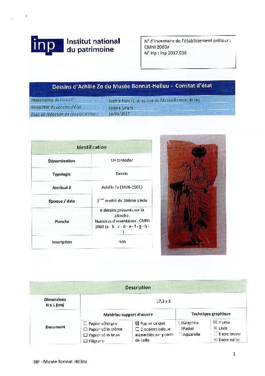 Constat d'état et traitement: Un toreador (Dessin attribué à Achille Zo)