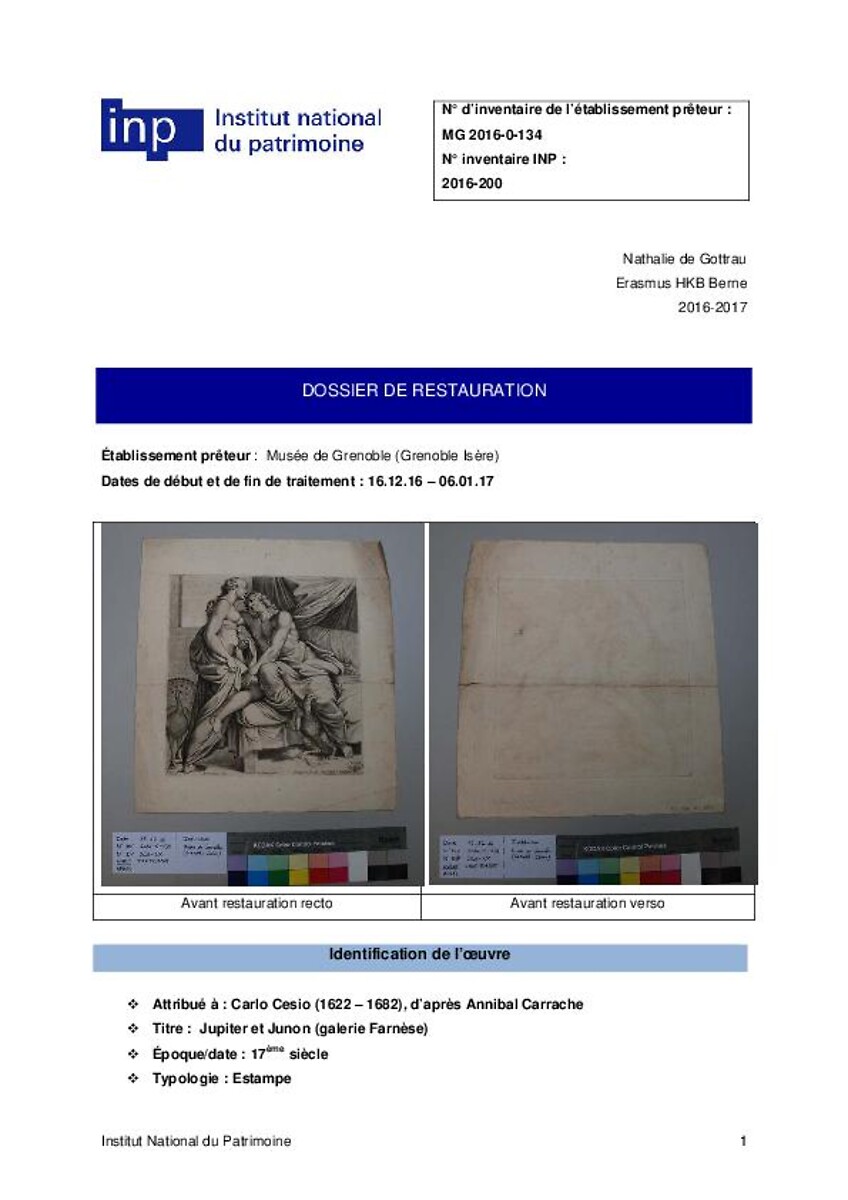 Dossier de restauration (Jupiter et Junon, galerie Farnèse, Attribué à Carlo Cesio, d’après Annibal Carrach)
