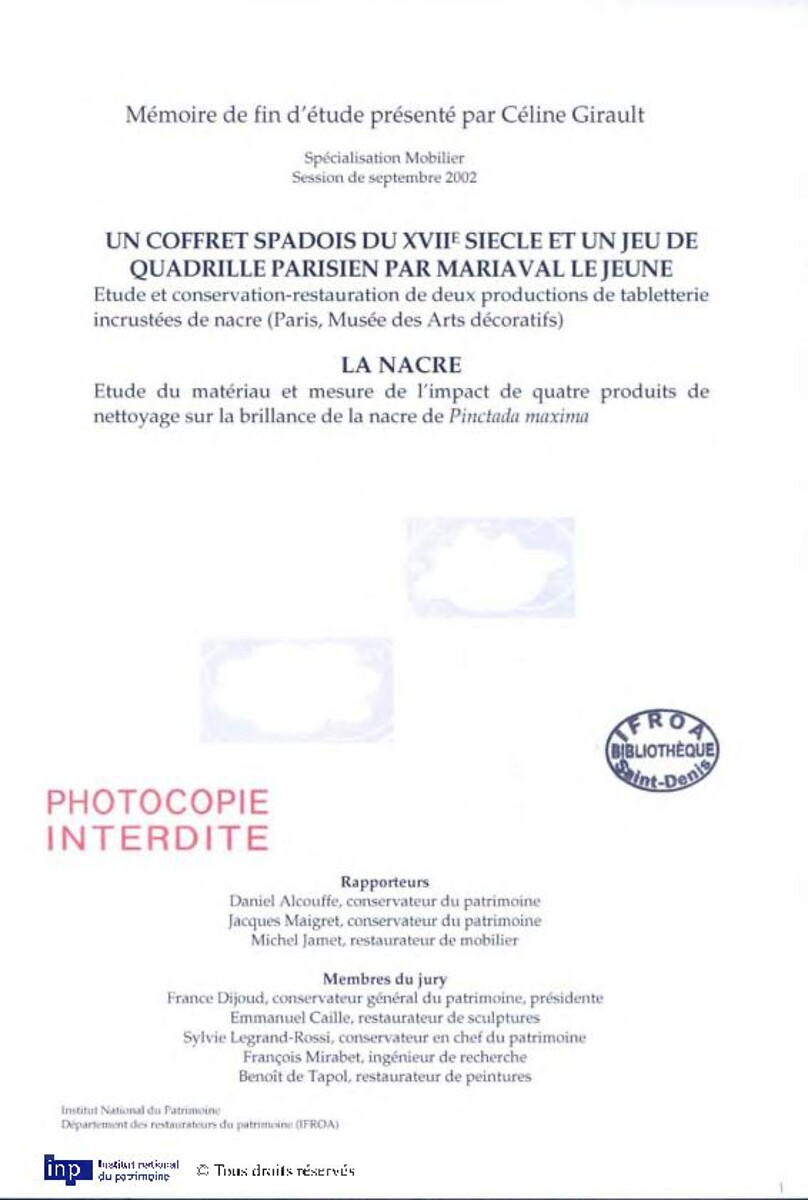 Un coffret spadois du XVIIe siècle et un jeu de quadrille parisien par Mariaval le Jeune : étude et conservation-restauration de deux productions de tabletterie incrustées de nacre (Paris, musée des Arts décoratifs). La nacre : étude du matériau et mesur…