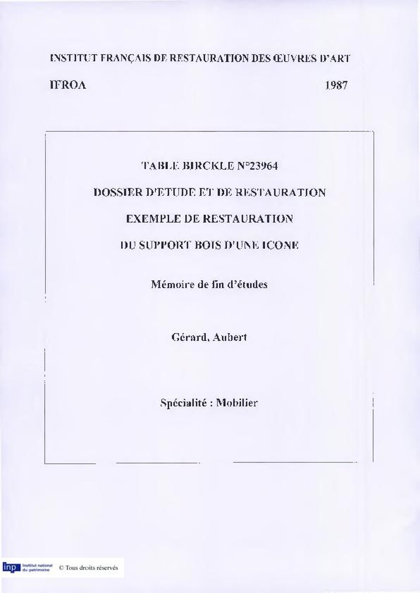 Table Birckle n°23964. Dossier d'étude et de restauration. Exemple de restauration du support bois d'une icône,1987