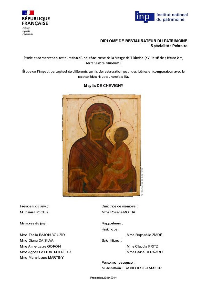 Étude et conservation-restauration d’une icône russe de la Vierge de Tikhvine (XVIIIe siècle ; Jérusalem, Terra Sancta Museum). Étude de l’impact perceptuel de différents vernis de restauration pour des icônes en comparaison avec la recette historique …