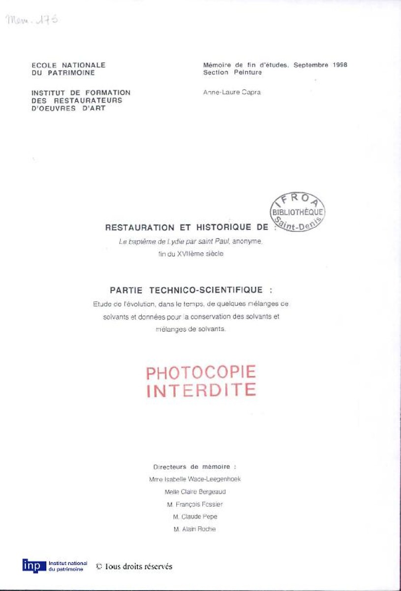 Restauration et historique du "Baptême de Lydie par saint Paul", anonyme, fin du XVIIe siècle : étude de l'évolution, dans le temps, de quelques mélanges de solvants et données pour la conservation des solvants et mélanges de solvants