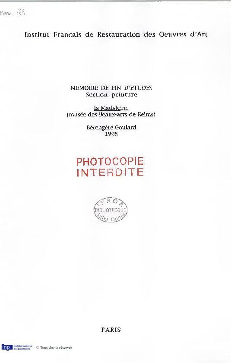 Restauration de "La Madeleine" (musée des Beaux-arts de Reims) : les Madeleine pénitentes du XIIIème au XIXème siècle. Etude d'une enzyme pour l'enlèvement d'un repeint protéique sur un tableau