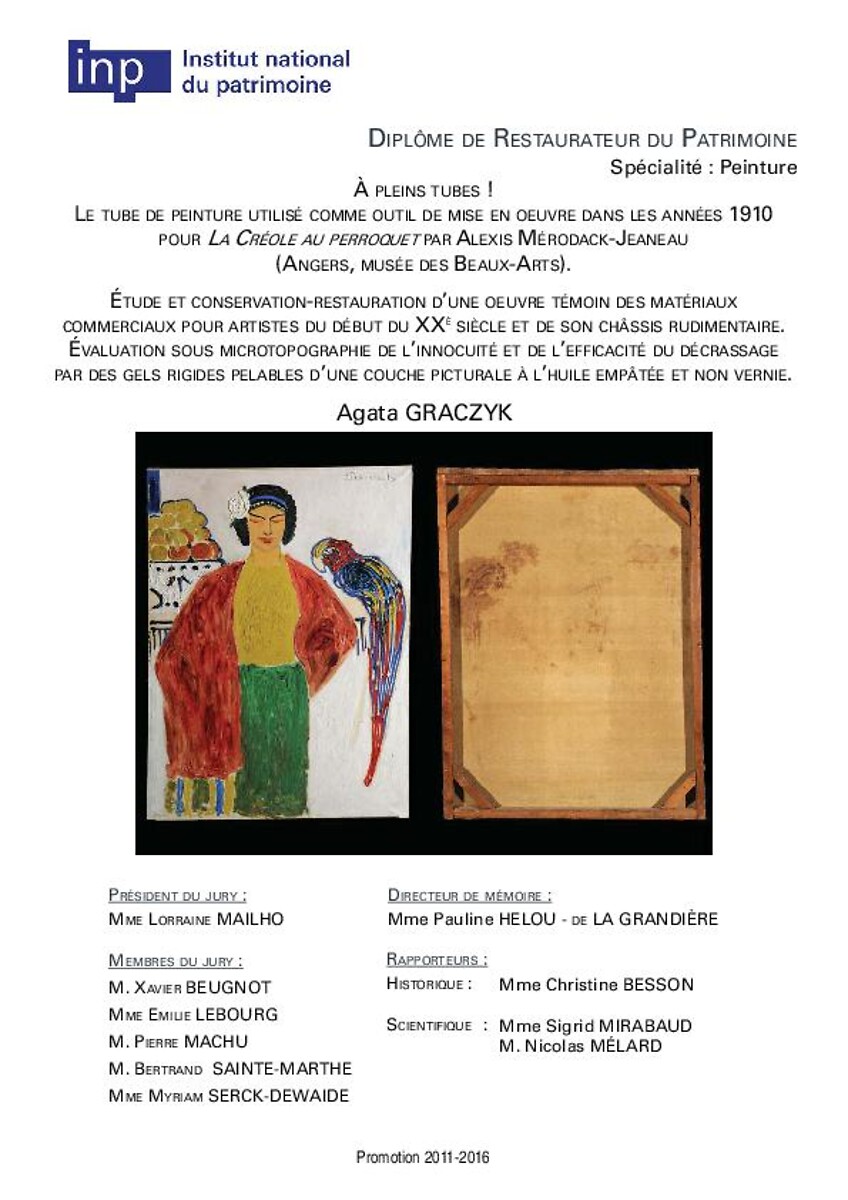 « A pleins tubes ! » Le tube de peinture utilisé comme outil de mise en oeuvre dans les années 1910 pour La Créole au perroquet par Alexis Mérodack-Jeaneau (musée des Beaux-Arts, Angers) : étude et conservation-restauration d'une oeuvre témoin des matéri…