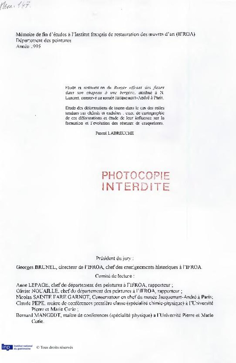 Etude et restauration du Berger offrant des fleurs dans son chapeau à une bergère, attribué à N. Lacret, conservé au Musée Jacquemart-André à Paris : étude des déformations de trame dans le cas des toiles tendues sur châssis et enduites. Essai de cartogr…