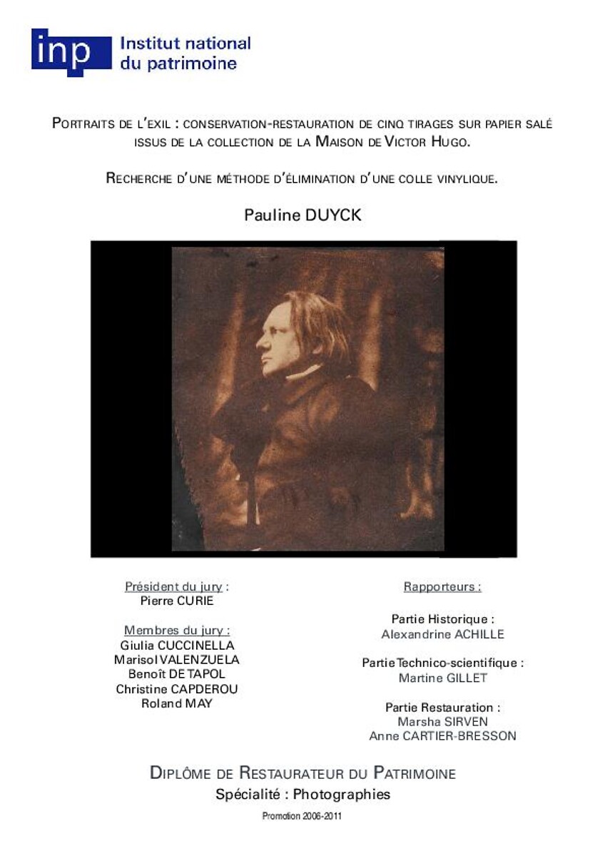 Portraits de l'exil : conservation-restauration de cinq tirages sur papier salé issus de la collection de la Maison de Victor Hugo. Recherche d'une méthode d'élimination d'une colle vinylique