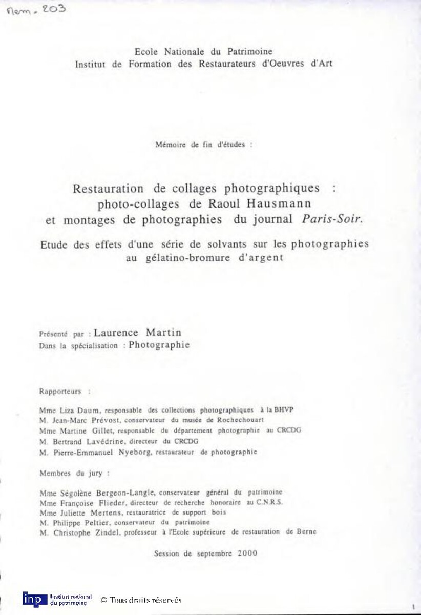 Restauration de collages photographiques : photo-collage de Raoul Hausmann et montages de photographies du journal « Paris-Soir », Etude des effets d'une série de solvants sur les photographies au gélatino-bromure d'argent2000