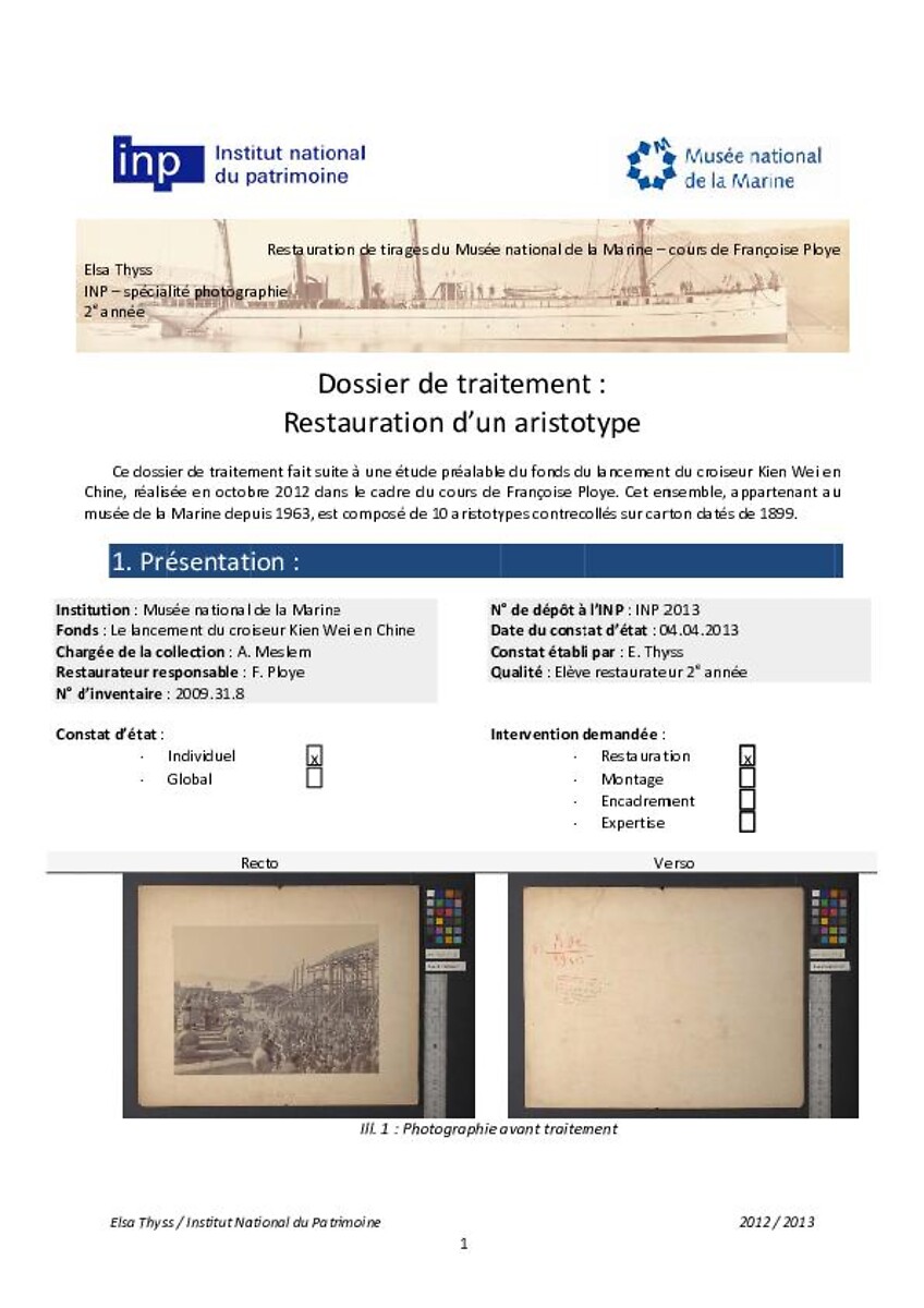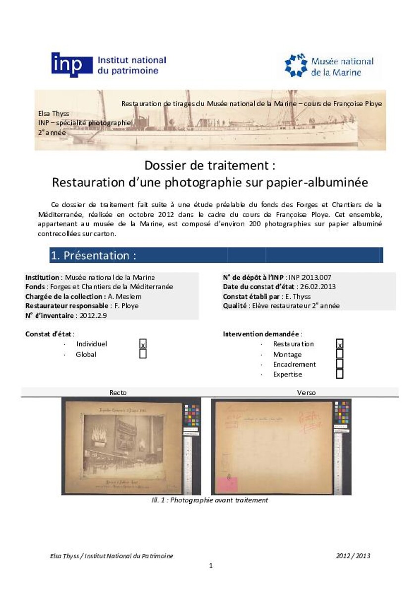 Etude préalable à la restauration de cinq fonds de photographies du Musée national de la marine