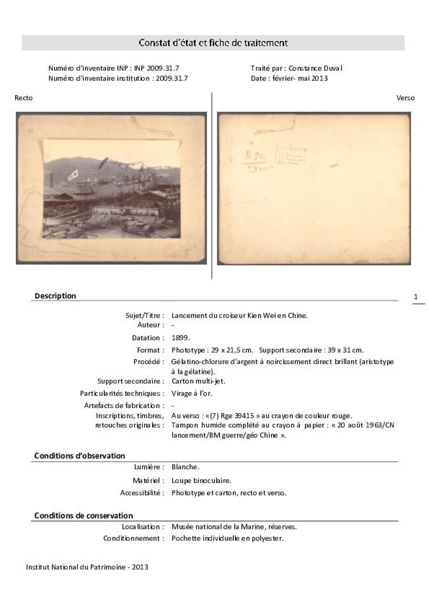 Constat d'état et fiche de traitement (Lancement du croiseur Kien Wei en Chine, inp 2009-31-7)