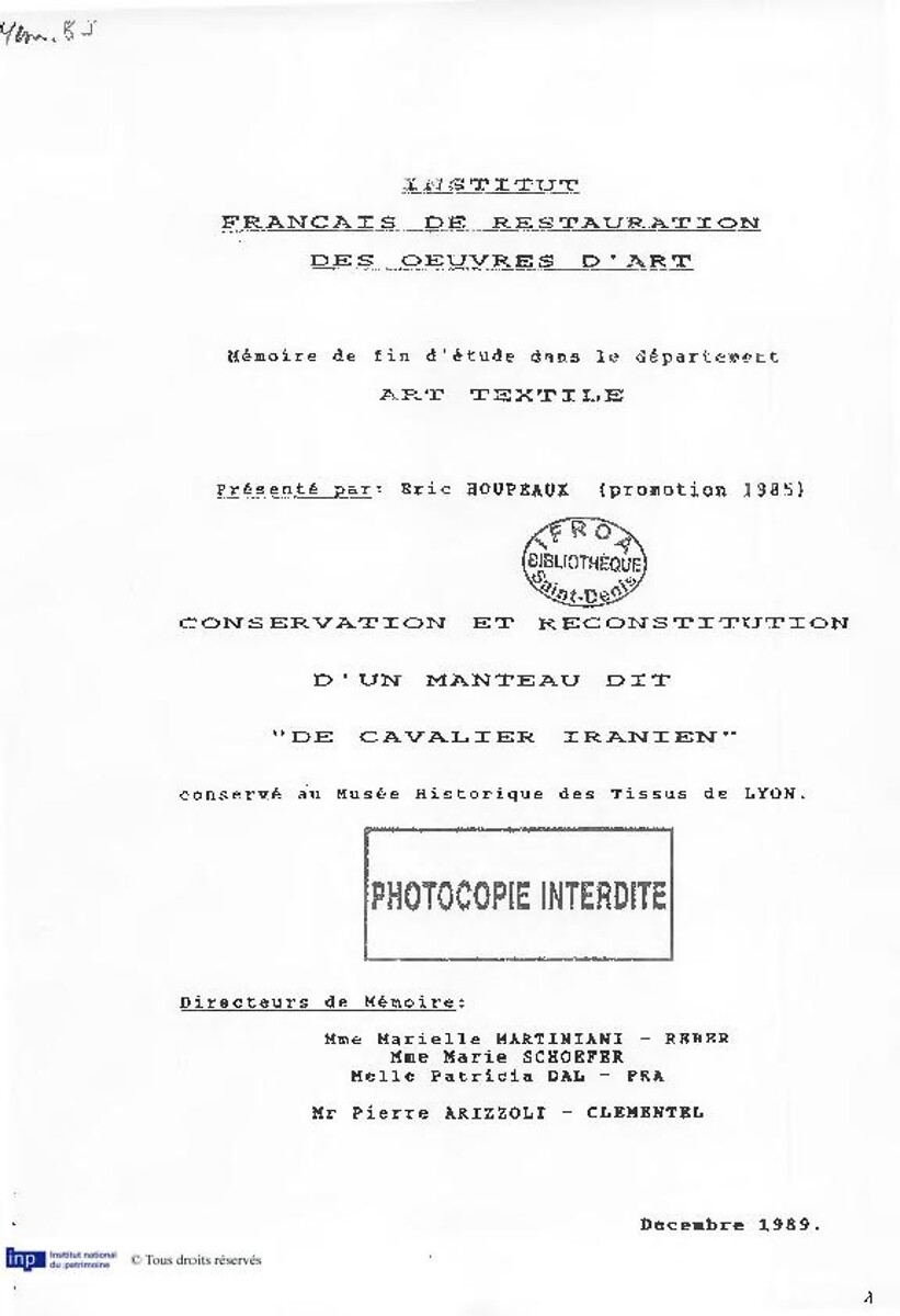 Conservation et reconstitution d'un manteau dit de « cavalier iranien » conservé au Musée historique des tissus de Lyon