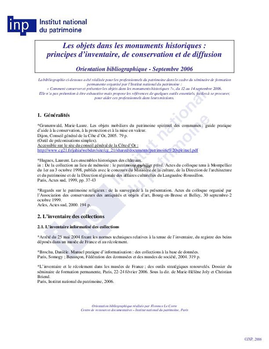 Objets dans les monuments historiques : principes d’inventaire, de conservation préventive et de diffusion