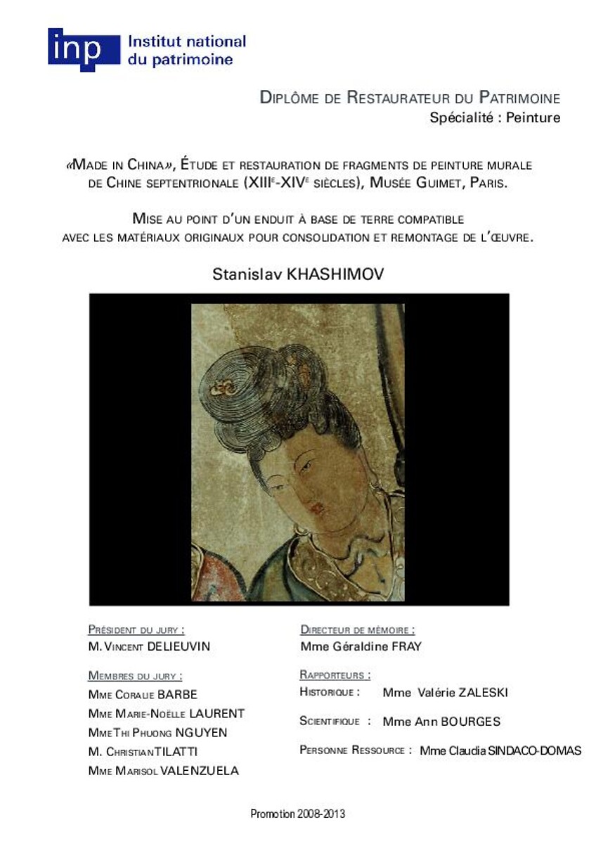« Made in China », étude et restauration de fragments de peinture murale en Chine septentrionale (XIIIe – XIVe siècles), Musée Guimet, Paris. Mise au point d’un enduit à base de terre compatible avec les materiaux originaux pour consolidation et remont…